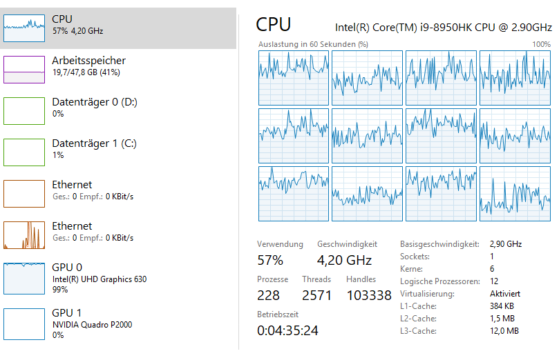 Wenn ich Deinen Screenshot vom Taskmanager richtig verstehe, hast Du einen Core i9-8950HK mit 6 Cores und 12 Threads im Einsatz.