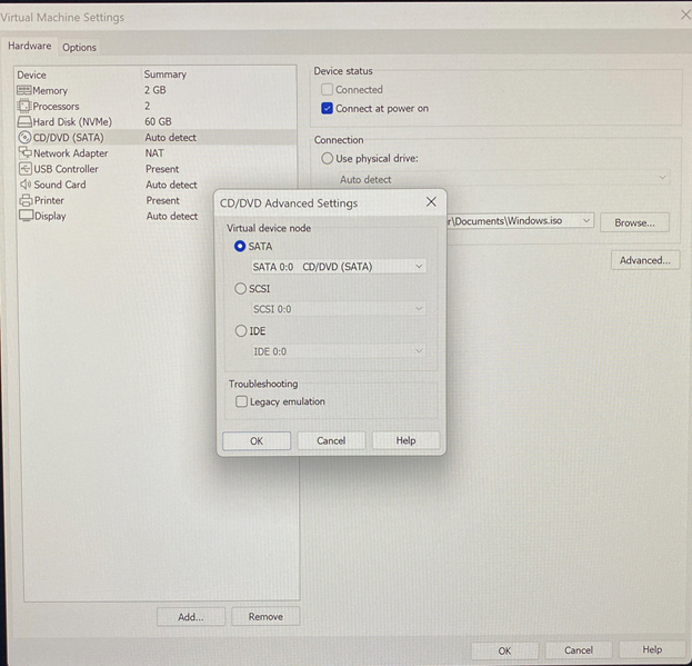 Du musst das CD ROM Laufwerk ganz nach oben verpflanzen, und in den Einstellungen zur VM die Windows ISO mounten. Dann sollte die VM von der ISO gebootet werden.