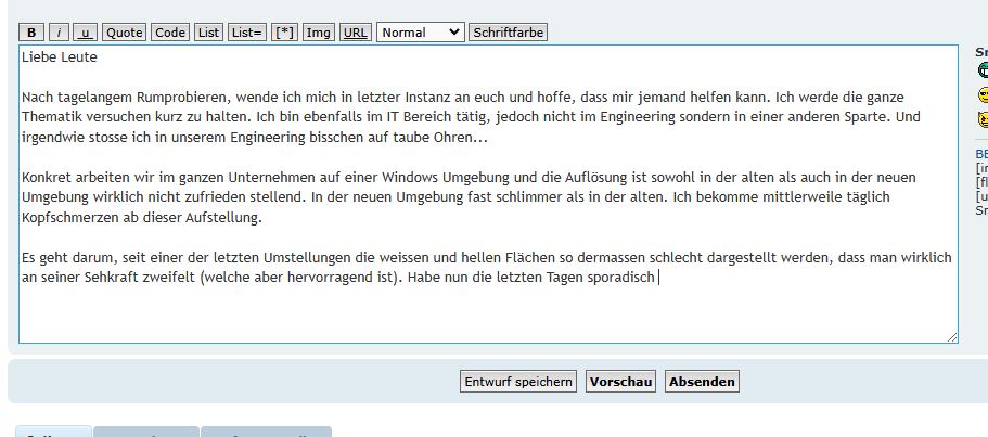 Konkret arbeiten wir im ganzen Unternehmen auf einer Windows Umgebung und die Auflösung ist sowohl in der alten als auch in der neuen Umgebung wirklich nicht zufrieden stellend. In der neuen Umgebung fast schlimmer als in der alten. Ich bekomme mittlerweile täglich Kopfschmerzen ab dieser Auflösung.