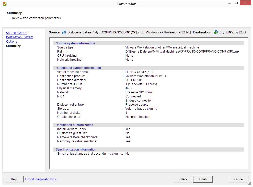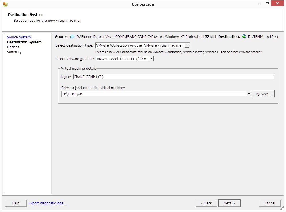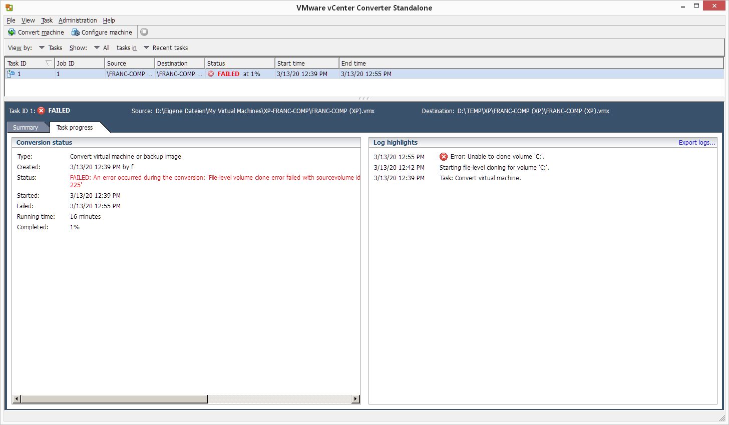 Allerdings kann ich die XP-VM nicht einlesen, nach einer guten Weile "Retrieving source machine information..." heißt es dann leider: