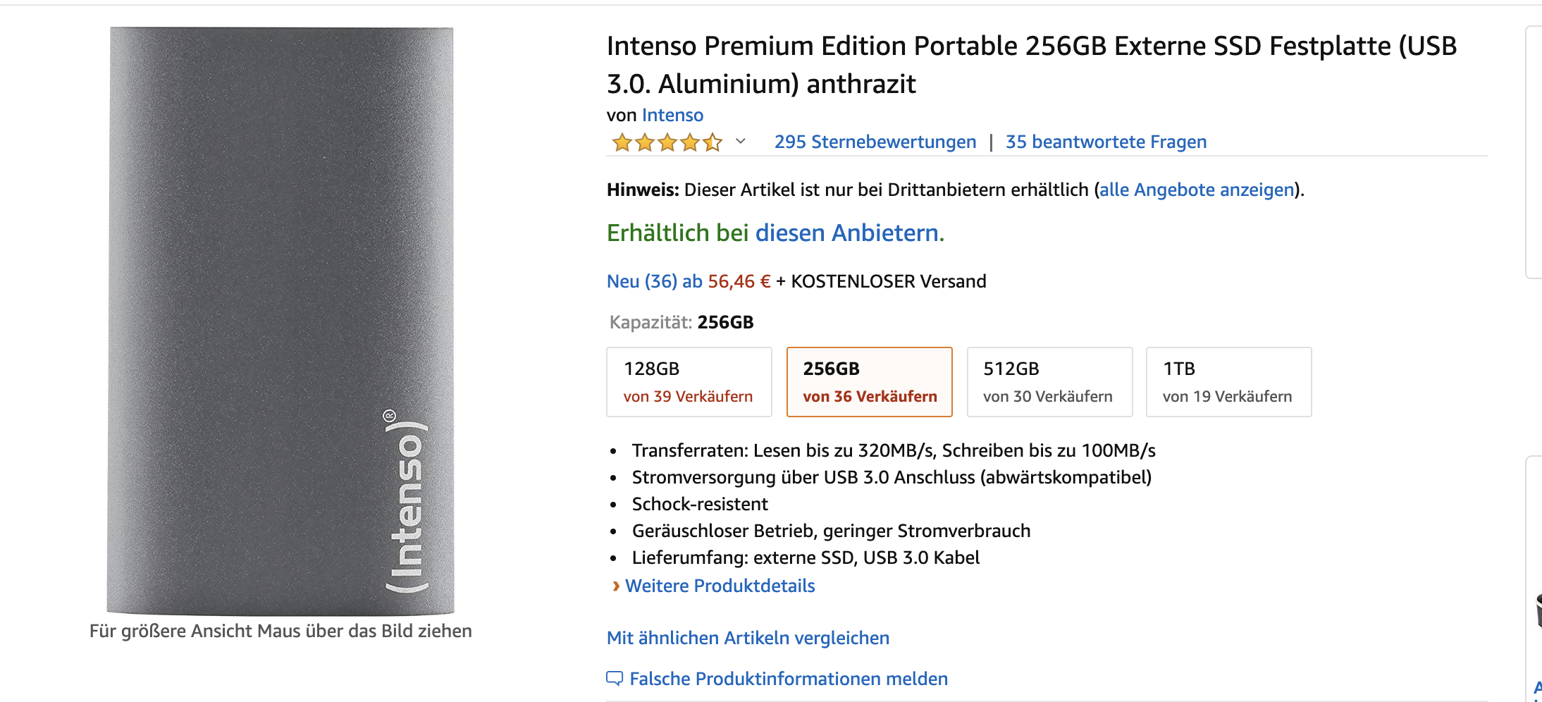 Ich musste mir aufgrund von Arbeiten eine Virtual Maschine zulegen , jedoch ist nun das Problem das ich das auf einen Macbook mache mit etwa 128GB , wodurch ich etwas eingeschränkt bin als Lösung wollte ich mir eine normale SSD Platte bei Amazon gekaufen eine nicht zu teuere aber auch nicht zu günstige , somit entschied ich mich für eine externe Intenso SSD .