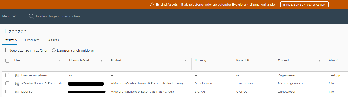 Ich habe eine VMware vCenter Server 6 Essentials Lizenz in meine neu aufgesetze vSphere Umgebung eingespielt.