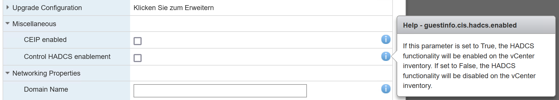 Hallo zusammen, ich bin gerade dabei einen neuen vCenter bereitzustellen und sehe eine mir unbekannte Option im Bereich Miscellaneous: Control HADCS enablement