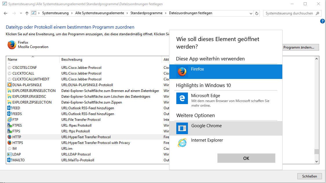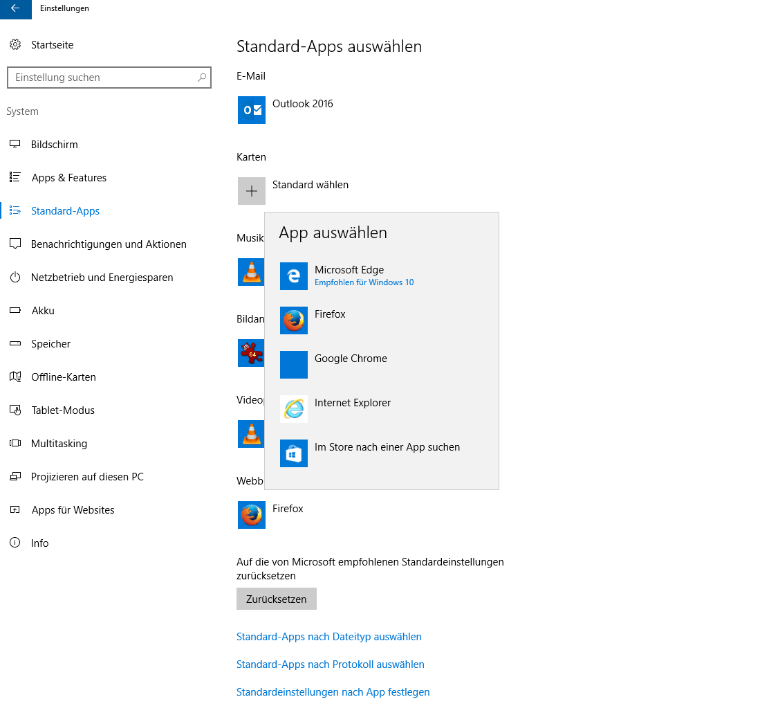 Unter Windows 10 habe ich aber keine Möglichkeit gefunden ein beliebiges Programm als „Standard-App“ auszuwählen. Ich kann nur aus den installierten Browser wählen oder mir einen neuen aus dem MS-Appstore installieren. Die entsprechenden Menues sehen so aus: