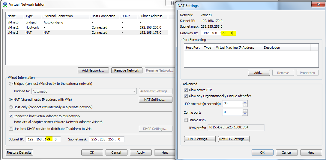 Anbei mal die Einstellungen als Vorschlag für das NAT Netzwerk im virtual Network Editor. Das NAT Netz muss natürlich zu deinem differieren, sonst könnte ja kein NAT stattfinden.
