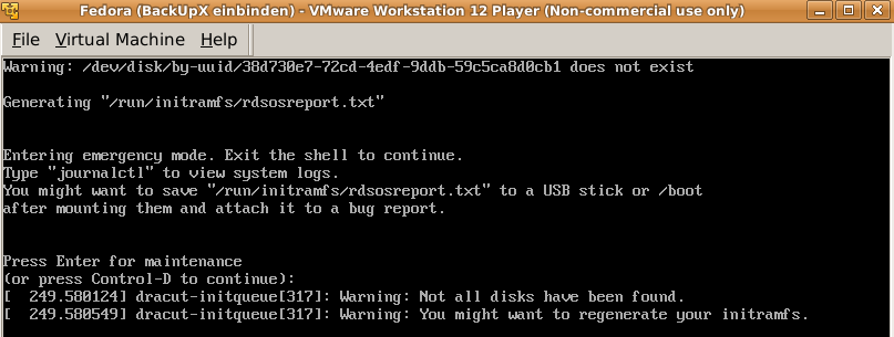 die VM mit obigem Ergebnis nicht funktioniert, gelingt es mit dem rescue-Kernel: