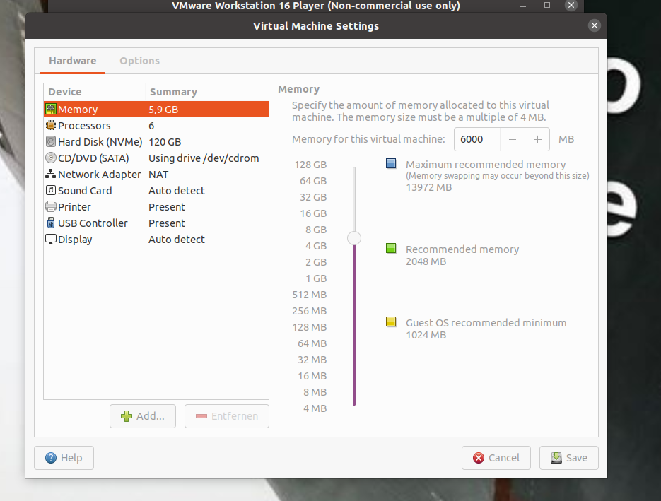 VMWare Workstation 16 Player mit Linux/Ubuntu: Grafikkarte und RAM