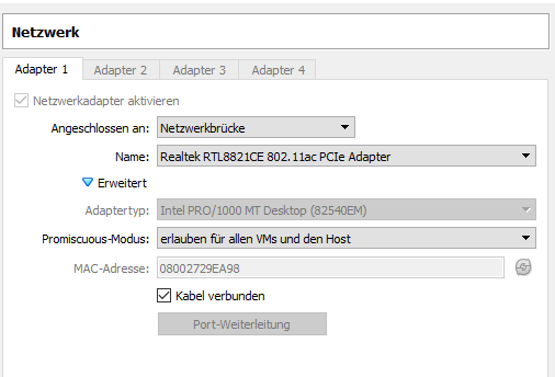 Die Netzwerk- Einstellungen in der VM sehen so aus: