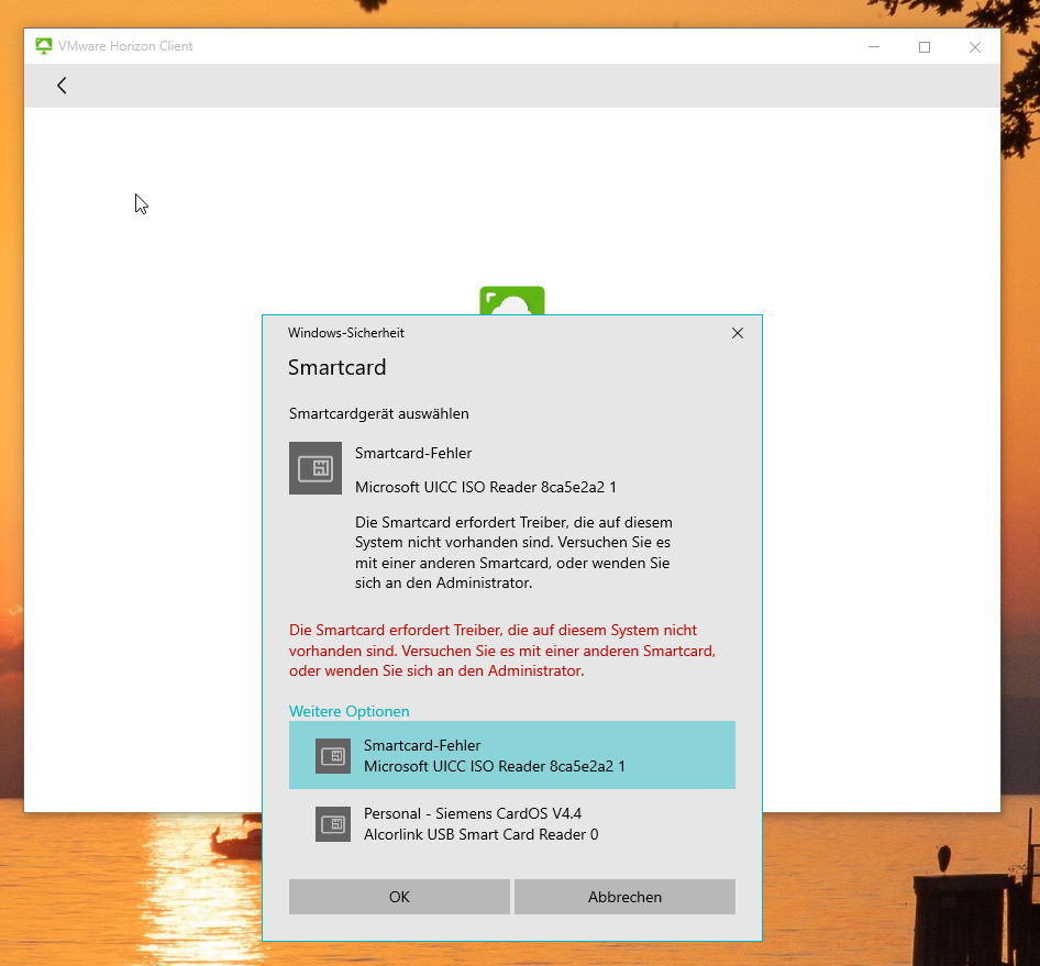 wenn wir uns über den VMware Horizon Client (Version 2209 / Build 8.7.0 (20649873)) mit PKI-Karte anmelden wollen,
