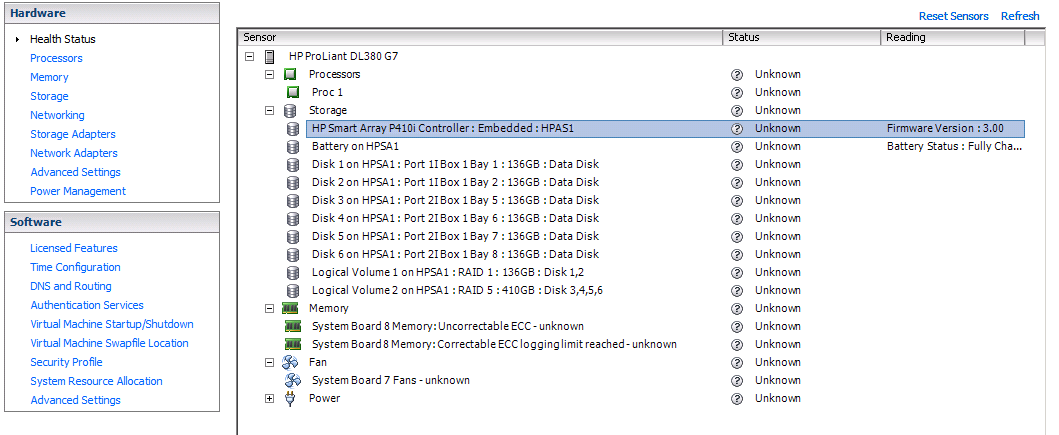Zweites Problem ist, dass unter Health Status (RAID Status, usw.) die Informationen teilweise lesbar sind und teilweise nicht. Nach einem Neustart des ESX funktioniert in der Regel das Monitoring für ein paar Tage.