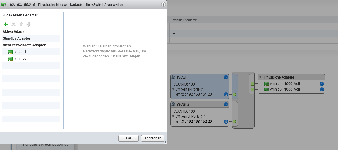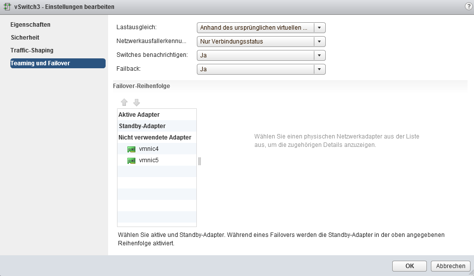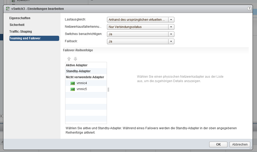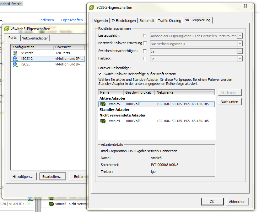 - Eigener vSwitch für die iSCSI Verbindungen, mind. 2 LAN-Anschlüsse, 1 pro physischen Switch. Im vSwitch die NIC-Gruppierung überall auf deaktiviert stellen