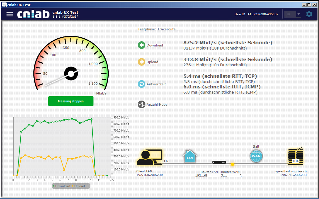 Kannst du mal als Vergleich einen realen Up- und Download (HTTPS, FTPS etc.) zu einem Host durchführen, der am besten bei deinem
