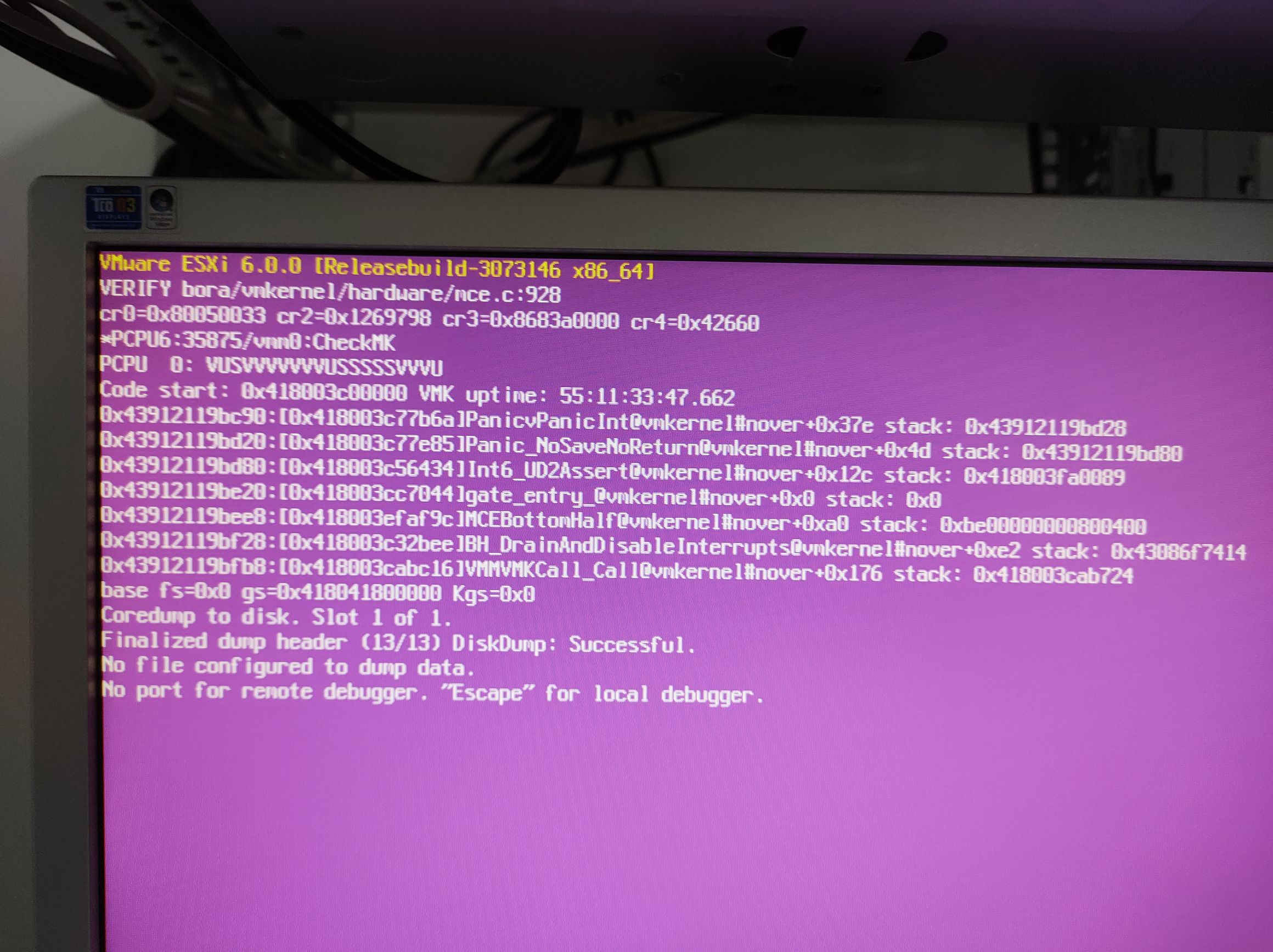 der ESXi-Server ist nach ner Weile mal wieder abgestürzt mit dem PSOD. Mein Kollege hat davon ein Foto gemacht.