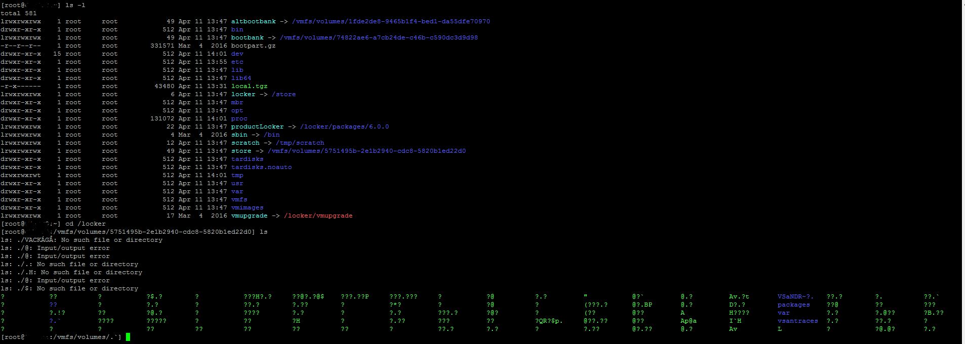 Der USB-Stick im Server (auf dem ESXi installiert ist) ist geschätzt 4 Jahre alt. Meiner Meinung hat der USB Stick (auf dem ESXi installiert ist) das zeitliche gesegnet bzw. wird das zeitliche segnen. Oder wie würdet ihr das sehen? Auf meinen anderen 2 ESXi-Hosts existiert der Buchstabensalat jedenfalls nicht.