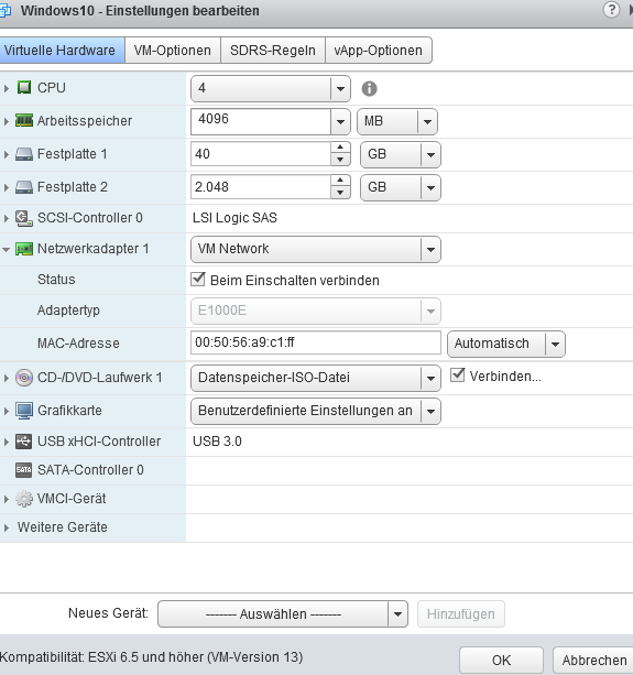 Wenn ich unterm vCenter, die Netzwerkkarte einer VM von E1000 auf VMXNET3 umstellen möchte, ist der Adapter Typ ausgegraut. Erst wenn ich mich per Web Client auf dem ESXi Host anmelde, ist es möglich unter der VM auf VMXNET3 zu wechseln.