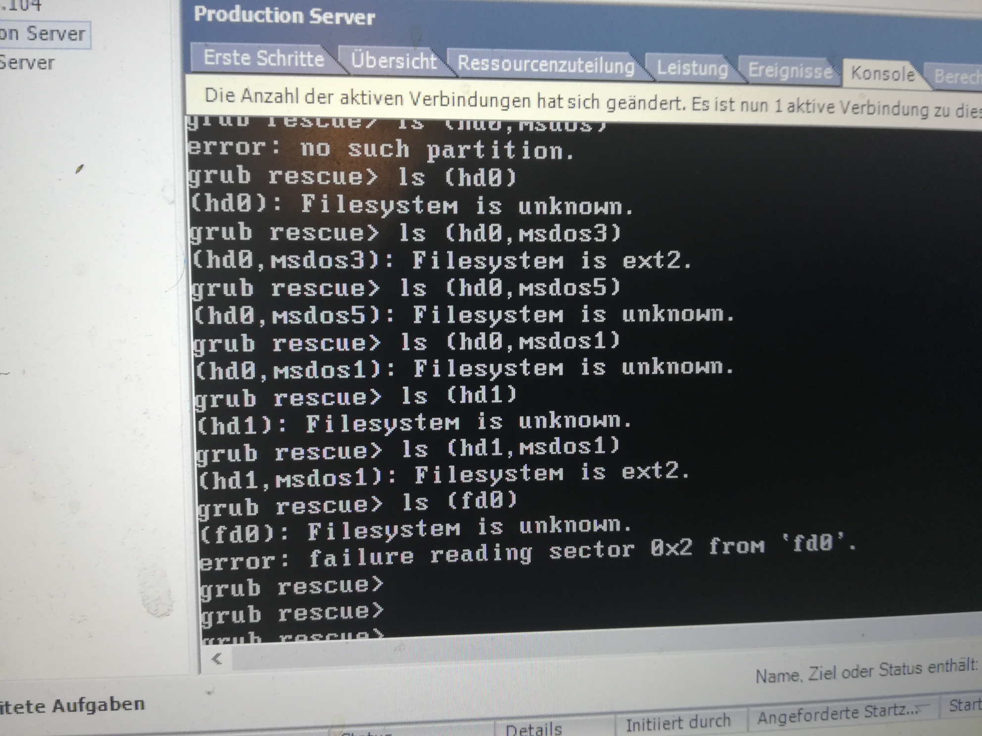 Eine VM auf meinem ESXi Host fährt nicht mehr hoch. Ich komme nur noch ins rescue grub (siehe Attachment).