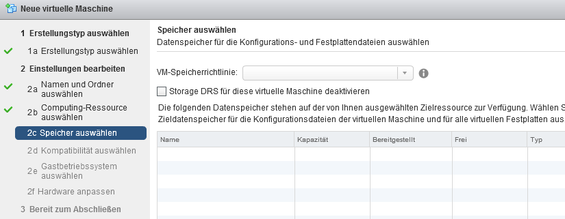 Wenn ich jetzt einen Testuser nehme und mich am vCenter anmelde um eine neue VM anzulegen, erscheint allerdings kein Datastore in der Speicherauswahl. Wird jetzt der Punkt "Storage DRS für diese virtuelle Maschine deaktivieren" ausgewählt, erscheinen alle Datastores.