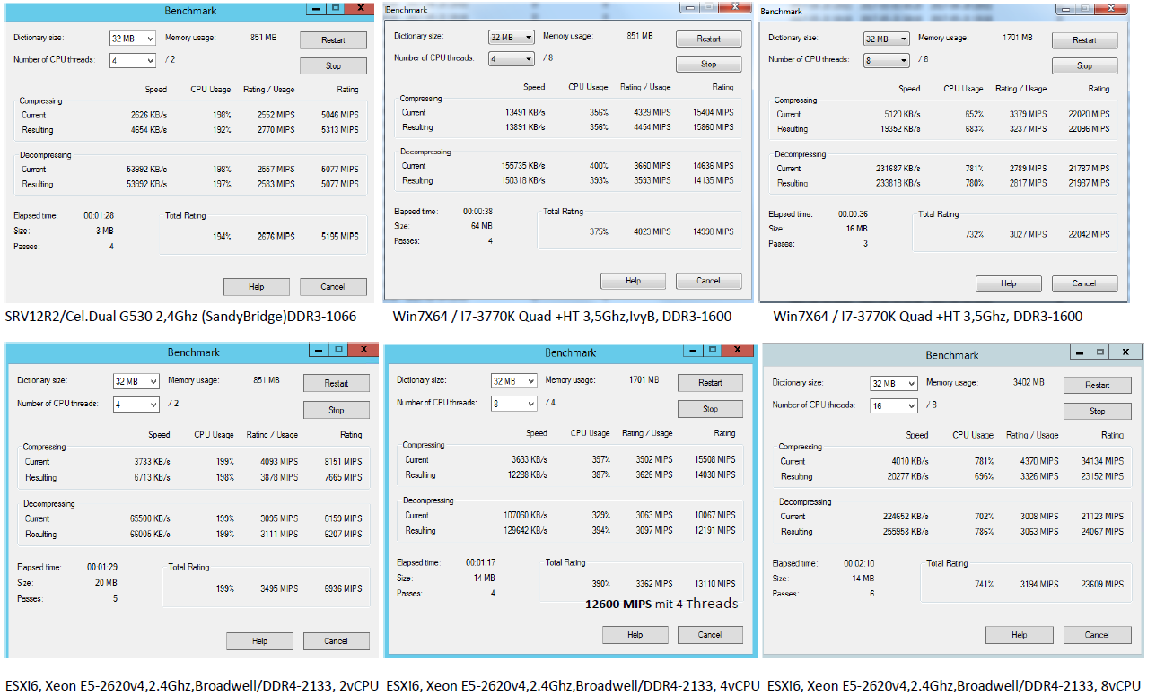 Anbei mal ein kurzer Test mit 7zip Portable 9.20. Ob der dafür überhaupt geeignet ist usw. da kann man ebenso streiten. Mir ging es nur um die Darstellung, das die Performance schon in der VM beim ESXi ankommt.