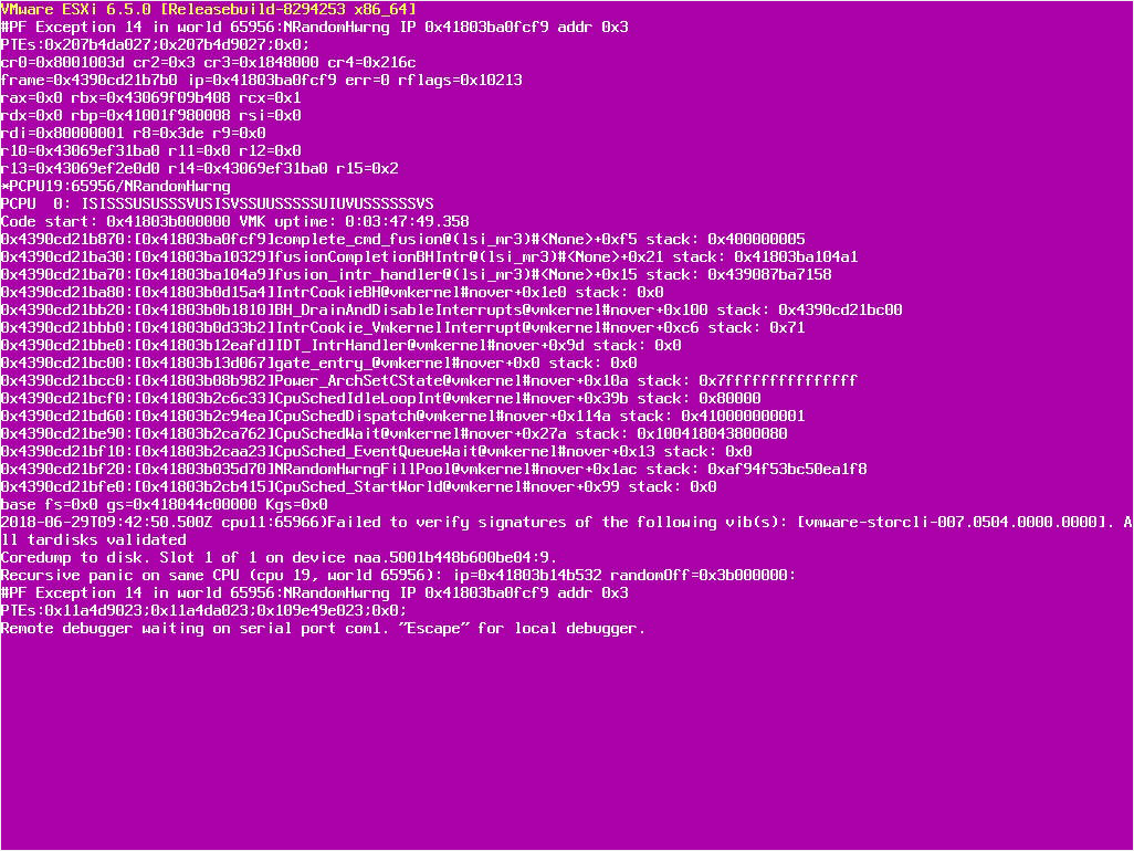 Hallo, wir haben seit Jahresbeginn einen neuen Supermicro-Server mit dem Intel C612 / LSI-3108 RAID-Chipsatz(s.u.), der unter 6.0 lief und sich zweimal aufgehängt hat, ohne dass wir irgendwas erkennen konnten - kein PSOD, nur keine Reaktion mehr auf Konsoleneingaben und die vm's waren unerreichbar. Nun haben wir ein update auf 6.5 gemacht, in der Hoffnung, dass dies die Probleme behebt (es kann natürlich Hardware sein, der Server wurde allerdings beim Hersteller 7 Tage burn-in getestet). Da hatten wir dann aber nach 3 Stunden einen PSOD, den hänge ich hier an. Da im PSOD von der storcli-vib, die wir installiert hatten, die Rede war, haben wir die mal runtergeschmissen und nun läuft das System seit einigen Tagen ohne Probleme. Klingelt da bei einem von Euch was? Ich habe an Broadcom eine Anfrage gestellt, bisher aber noch keine Antwort erhalten.