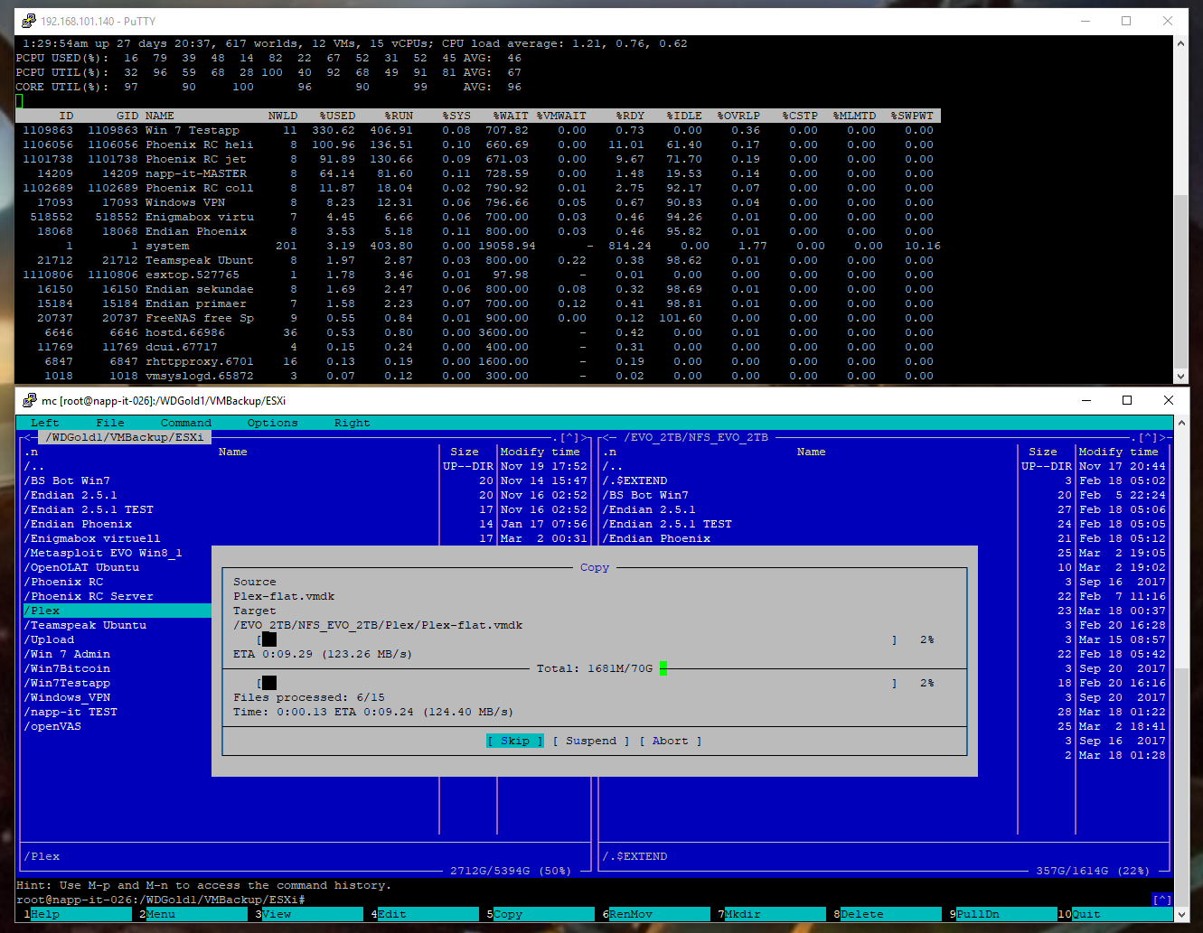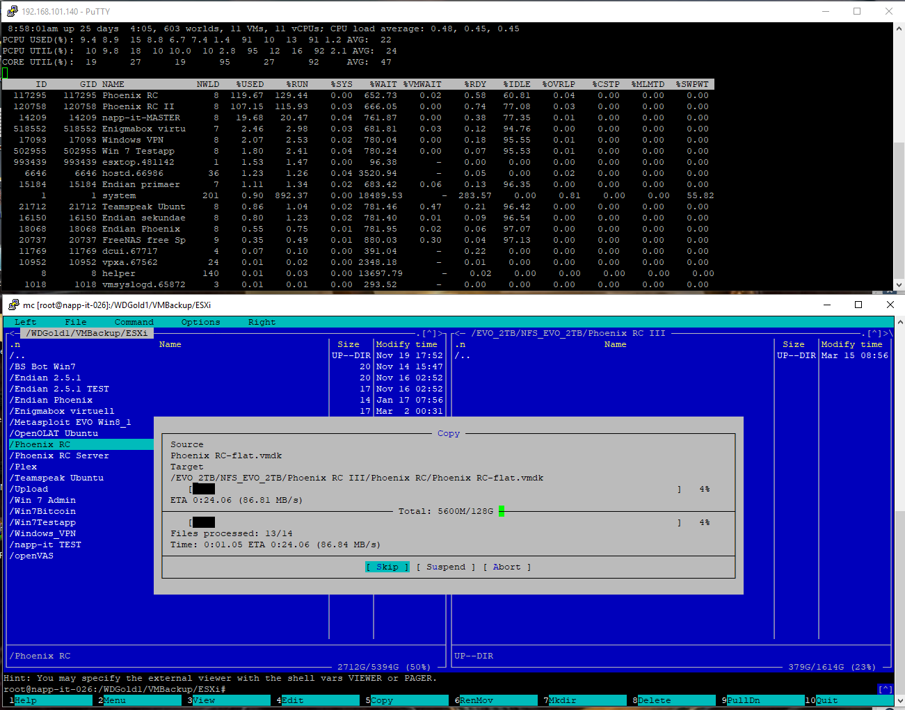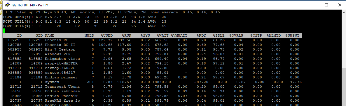 Ich füge noch einen esxtop Screenshot an. Leider habe ich keine Ahnung, wie dieser zu interpretieren ist. Auf welche Werte muss ich da achten?