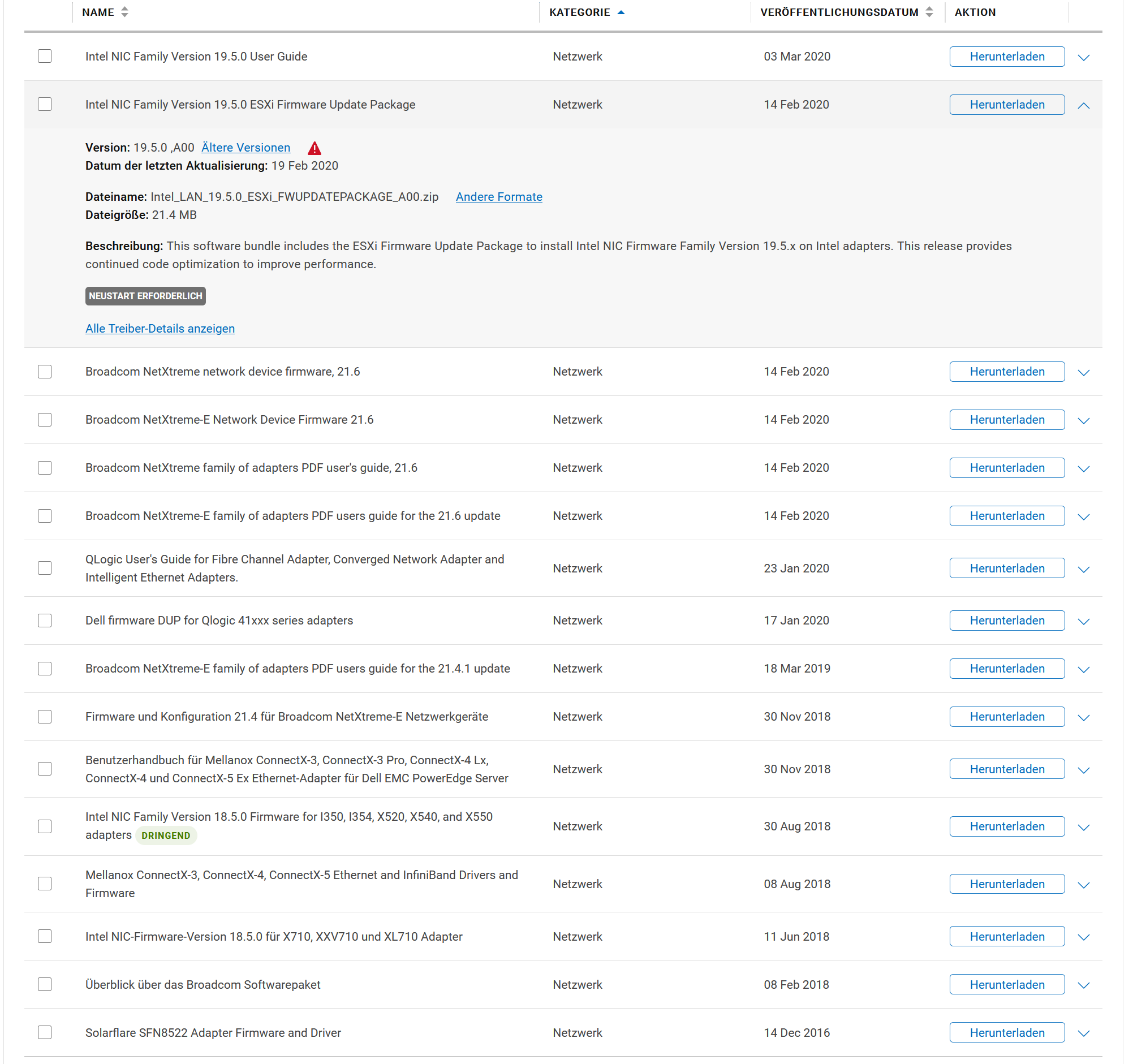 - Fuer alle NIC Hersteller listet Dell Update mit Datum Februar