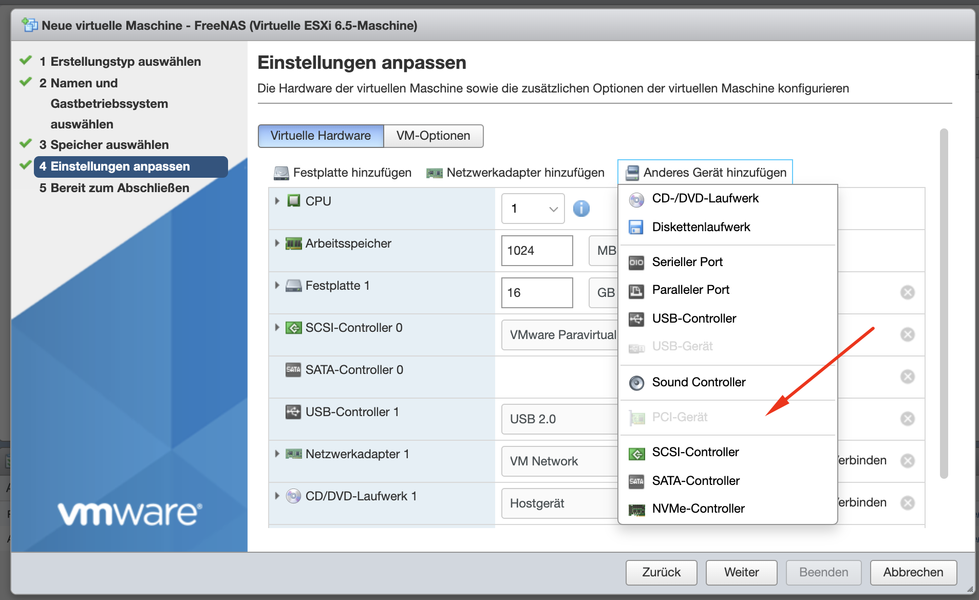 Aufsetzen einer FreeNas VM mit durch gereichtem LSI SAS2008 RAID Controller.