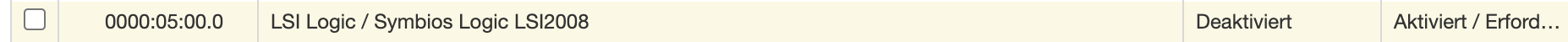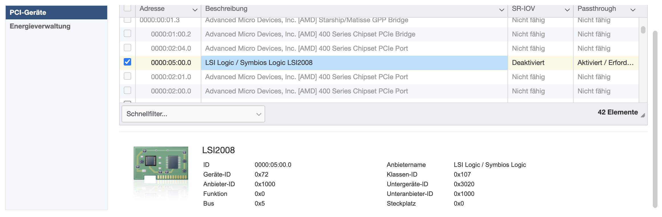 Wenn ich Passthrough für die PCI Karte aktiviere kann ich auch nach einem Neustart nicht mehr den LSI Controller auswählen um einen weiteren "Neuen Datenspeicher" hinzuzufügen. Aber in den Passthrough Einstellungen wird dieser immer noch angezeigt, dass ein Neustart durchgeführt werden muss. Sehr strange...