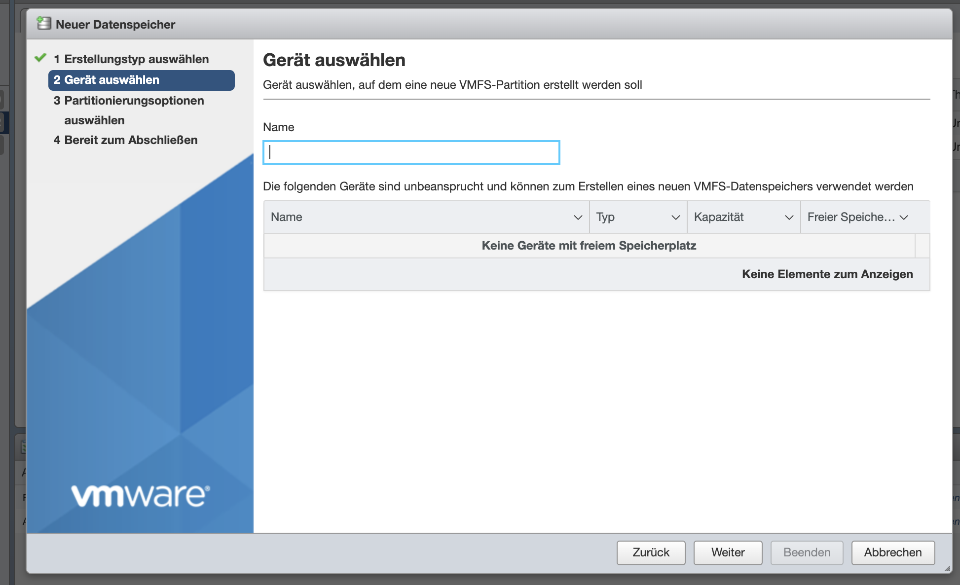 Gebootet wird der Hypervisor über die SSD welche direkt am MB angeschlossen ist. Ich hatte die Konstellation so weit am laufen, dass FreeNAS lief und ich im ESXI einen Zusätzlichen Datenspeicher (Unter Speicher -> Neuer Datenspeicher) hinzugefügt habe. Meine Überlegung war, das RAID ist ja auf der Hardwareebene und im FreeNAS habe ich dann einen Datastore angelegt.