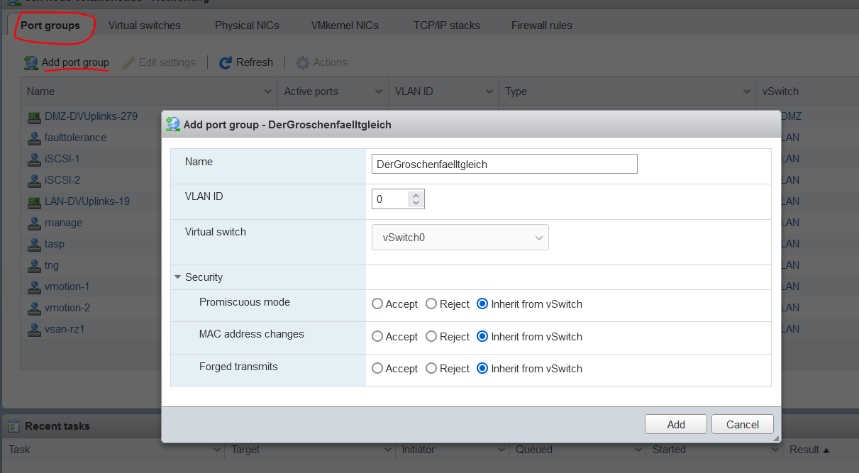 Ich kenne die Menufuehrung im Hostclient nicht so im Detail weil ich die Massenkonfig von cmd/Script und spaeter dann im vSphere Client machen. Aber du brauchst eine "normale" Portgroup vom Typ "Virtual Maschine Network".