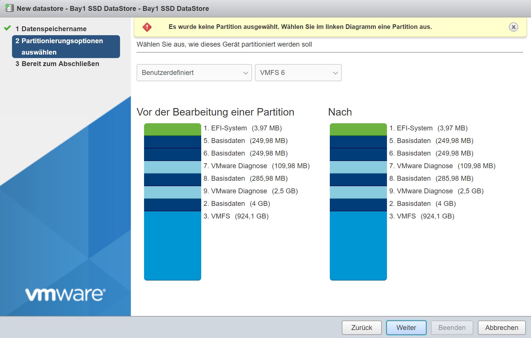 Ich möchte die Partition 3 (siehe ScreenShot 'New DataStore') als 'Bay1 SSD DataStore' wieder im System sehen.