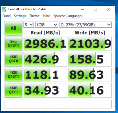 Oder sind das Werte aus einer Hyper-V VM? Selbst wenn, ist eine Testgröße von 1GB wenig hilfreich, da sind die Werte schon durch den Windows Cache verfälscht bei der kleinen Testgröße. Sollte wenigstens 4-8GB sein.