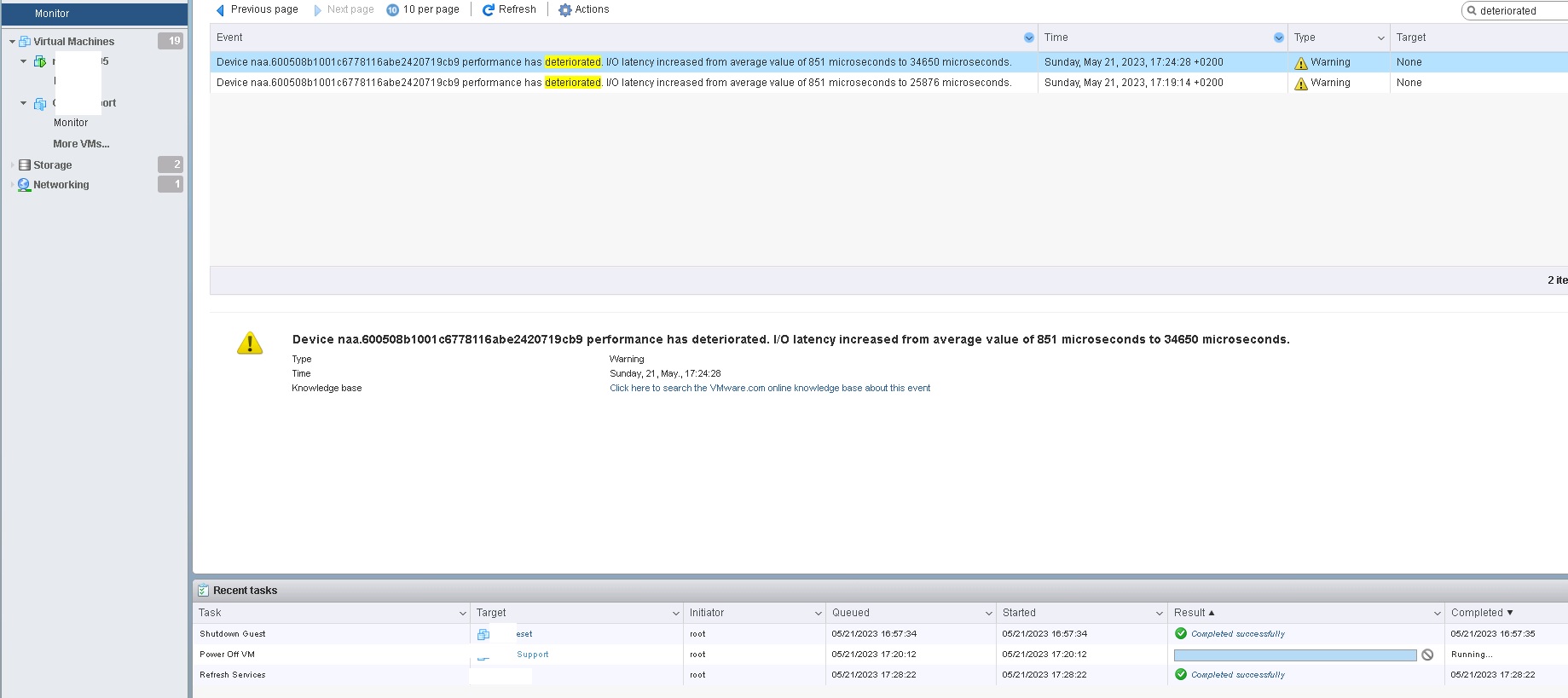 ESXtop waere evtl. mitteilsammer bzw. mal in vmkernel.log und hostd.log gucken. Sehr unangenehm sind HDD Retry Versuche welche man nur sieht wenn man mal das HW Controller log zieht. Sprich die Disk ist noch nicht ausgefallen bzw. die Schwellwerte sind noch nicht erreicht. Aber in einem HW RAID gibt die langsamste Disks das Tempo vor. Im ESXi sieht man das an unterirdischen Latenzwerten welche extrem schwanken.