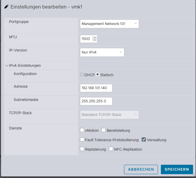 vmk1 hat eine statische IP-Adresse aus einem anderen SUB-Netz bekommen. Den Eintrag "Standard-Gateway" habe ich mit dem richtigen Wert überschrieben.