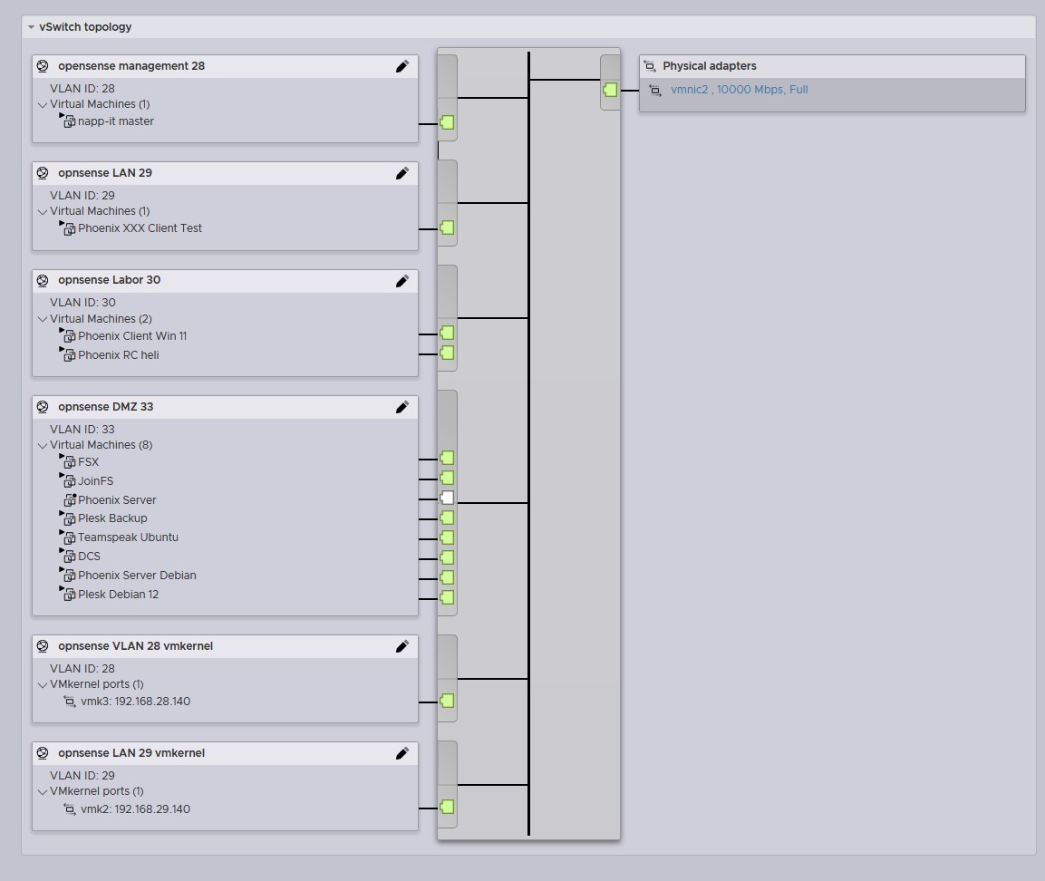 Bislang hatte ich immer mehrere vSwitches, und bin die ungetagged mit mehreren Strippen angefahren. Jetzt habe ich eine neue Firewall, und fahre einen einzelnen vSwitch getagged mit einem Kabel an.
