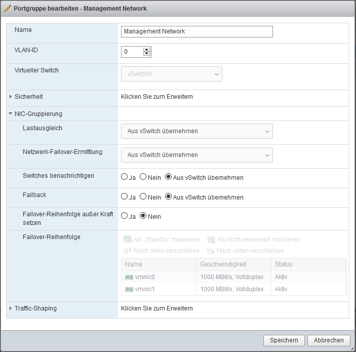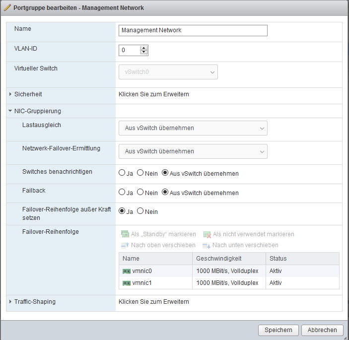 • Warum müssen bei vSwitch0 beide NIC Aktiv sein? (andernfalls funktioniert es bei mir ja auch nicht)