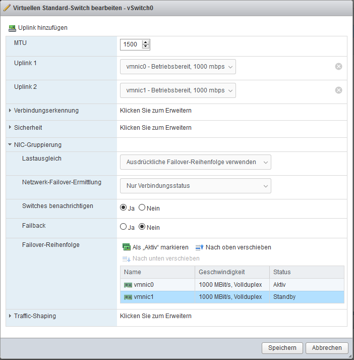 • Ich habe ja in Wirklichkeit eine Aktive und Passive physische NIC - müsste dann nicht irgendwo (vSwitch/Portgruppe) zwingend NIC als passiv markiert sein? Oder ist das egal weil die "Signalprüfung" die zweite NIC ohnehin inaktiv setzt?