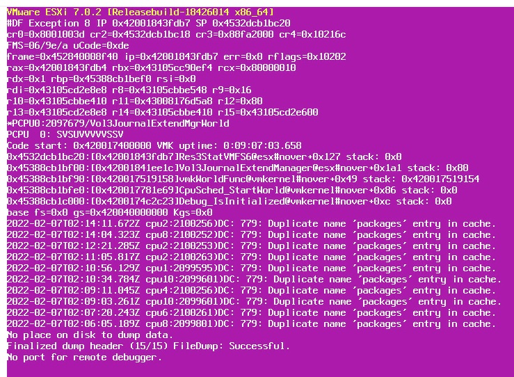 ich habe einen TERRA SERVER 4230 G4 mit Intel(R) Xeon(R) E-2276G CPU, es ist ESXI 7.0.2 Build 18426014 installiert. Der Server läuft seit Monaten stabil. Nun hatte er aber zwei PSOD´s innerhalt 24 Stunden mit den ich überhaupt nicht weiter komme. Ich habe schon viel im Netz gesucht aber bin auf nichts brauchbares gestossen. Es handelt sich wie im Bild zu sehen um die Fehler: