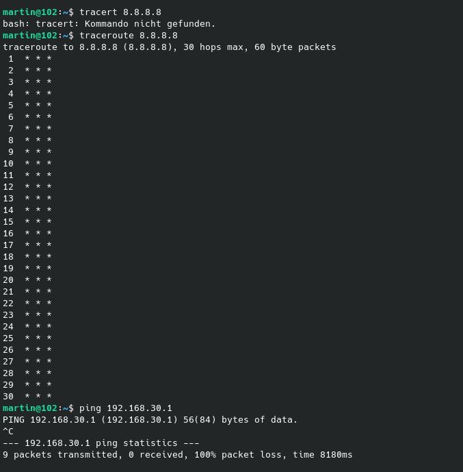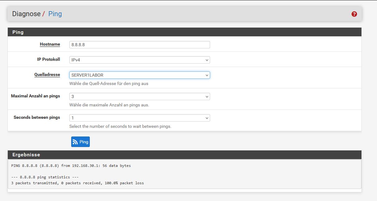 Den Gateway selber kann ich nicht pingen. Auf der FW selbst aber schon. Raus komme ich nirgends.