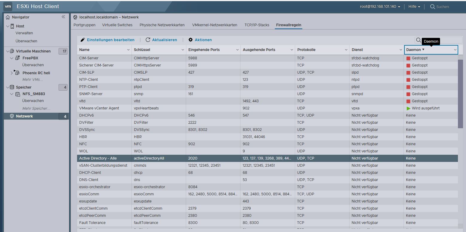 In der ESXi Firewall habe ich noch nie was gemacht. Bei den Einstellungen sind da "Alle Verbindungen von allen IP Adressen zulassen" drin.