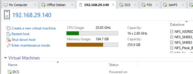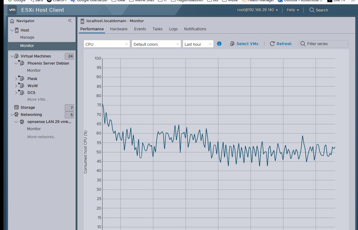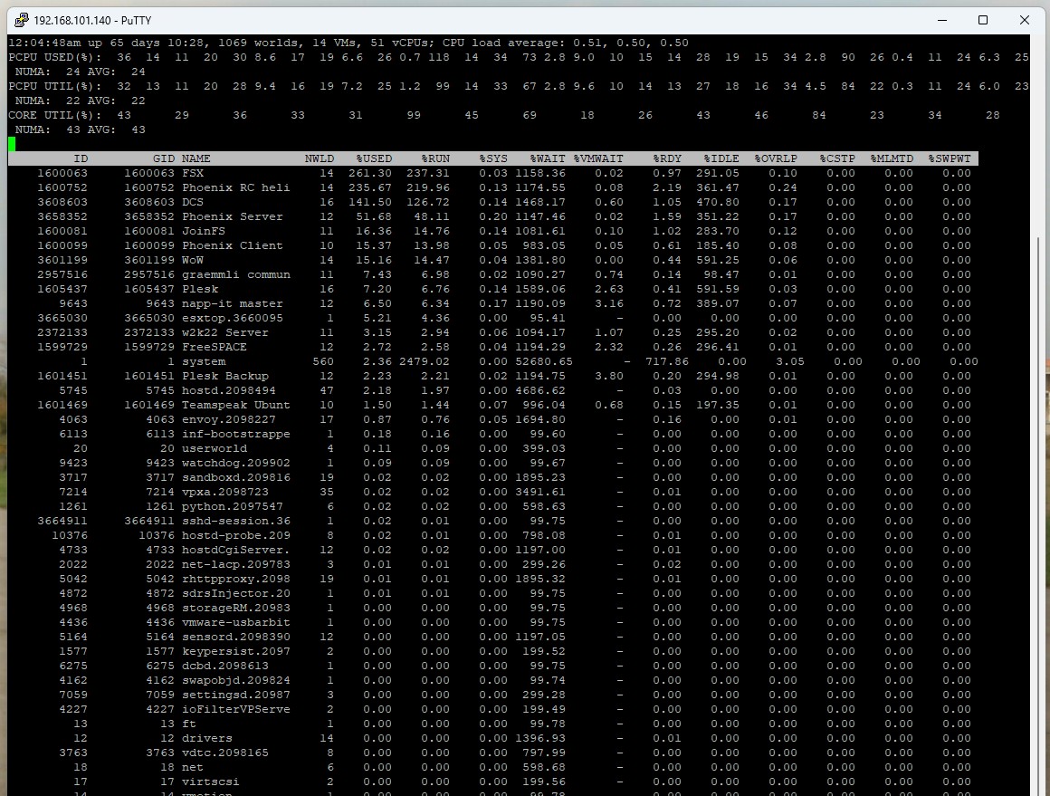 Wenn ich im Hostclient die Auslatung anzeigen lasse, steht da im "Idle" immer so 45-55%. In vmware Workstation wird die Auslastung immer viel niedriger angezeigt. Vermute, der Hostclient rechnet Auslastung /16, die WS Pro /32. Habe auch mal einen esxtop Screenshot angefügt, aber werde daraus auch nicht wirklich schlau.
