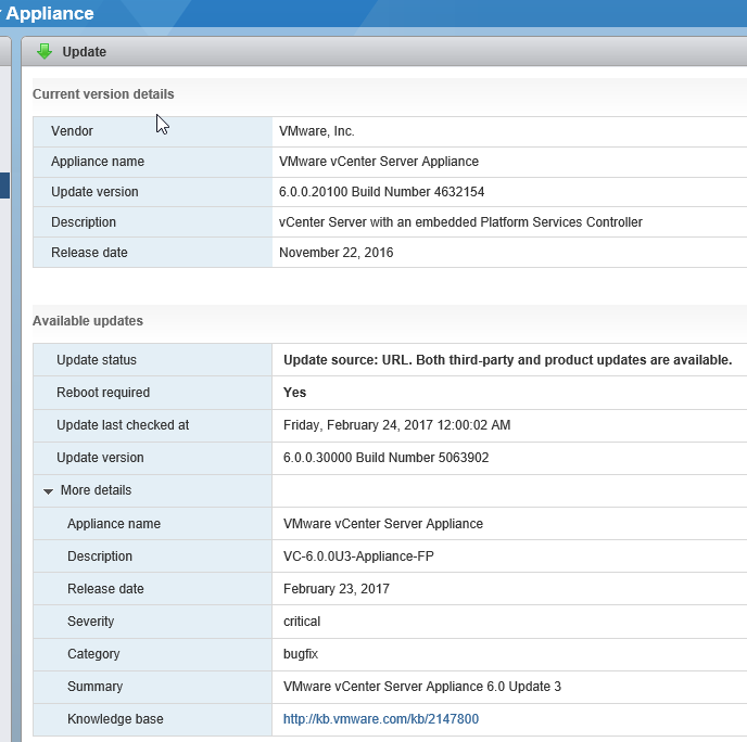Heut morgen habe ich auf einem unserer drei vCenter Server (alle version 6.0.0.20100 Build Number 4632154) eine Meldung bekommen, dass das Update 3 zur Verfügung steht. Screenshot siehe Anhang