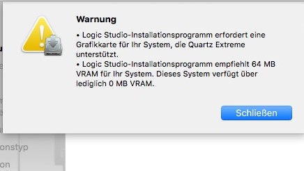 ich habe ein Problem. Ich habe nach einer Möglichkeit gesucht, Logic Studio (gibt es nur als MacOS-Software) auf meinem Windows-Rechner zu installieren. Als Lösung bin ich auf VMware gestoßen. Ich habe also nach YouTube-Recherche eine Version von MacOSX in der VM installiert. Hat auch alles wunderbar funktioniert. OSX läuft einwandfrei. Bei der Installation von Logic ist jetzt aber ein Problem aufgetreten: Scheinbar gibt es ein Problem mit der virtuellen Grafik-Karte. Ich erhalte immer die folgende Meldung: