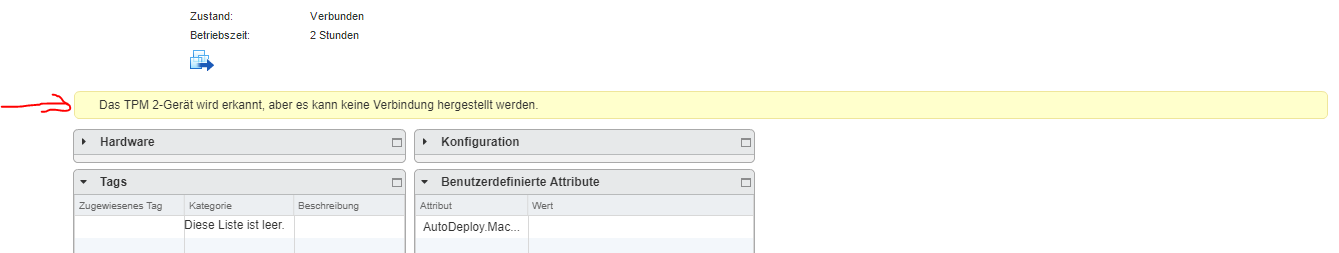 ich habe auf meinem NUC i7 den ESXi 6.7 installiert. Ich habe den Alarm "Alarm für TPM-Hostnachweis" deaktiviert, weil mich die Meldung genervt hat.