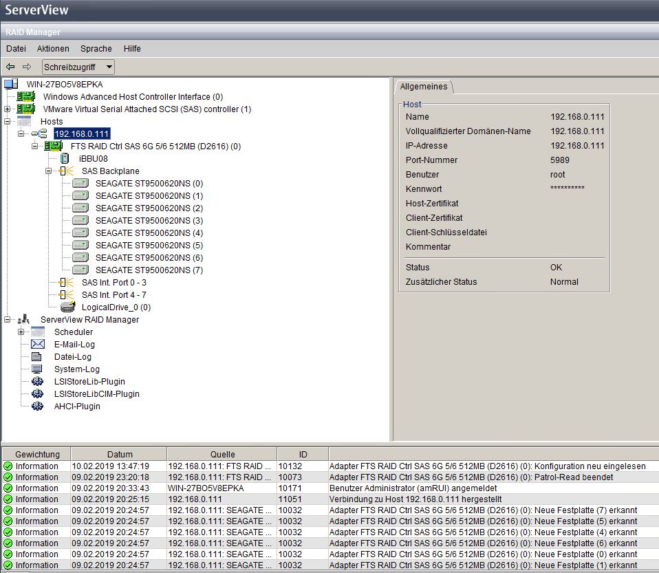 Als ich dann am Abend nachdem mein Sohn im Bett war die VM mit dem ServerView RAID Manager gestartet habe, lief die Überwachung wieder. Bis jetzt ohne Probleme.