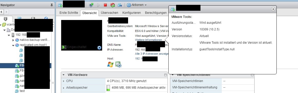 Wenn ich meine test-Vm von host 6.0 auf 6.7 migiere, dann zeigt sie mir am 6.0.0 GuestToolInstallType.Null und am 6.7 MSI an. Das wird bei den anderen VMs auch so sein, denke ich. Ich frage mich jetzt halt, ob ich total am Holzweg bin und da snormal ist, und die ursache für mein Nakivo-backup-Problem woanders liegt, oder ob da sso nicht normal ist und der 6.0.0-host irgendwas hat?