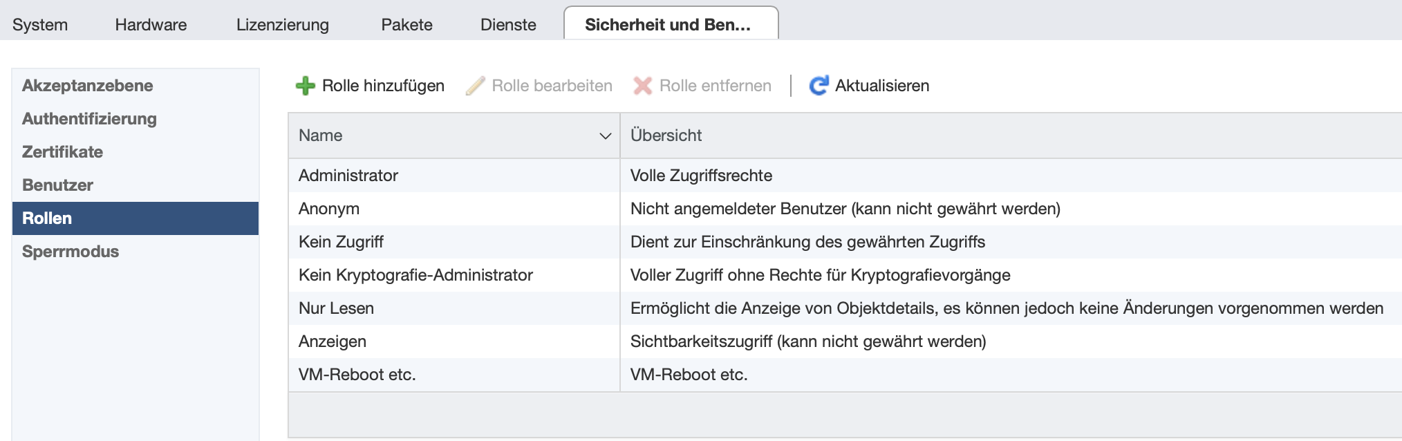 Eine hierarchische Auflistung aller Berechtigungen gibt es unter https://docs.vmware.com/en/VMware-vSphere/6.7/com.vmware.vsphere.vm_admin.doc/GUID-18F4B892-D685-4473-AC25-3195D68DFD90.html