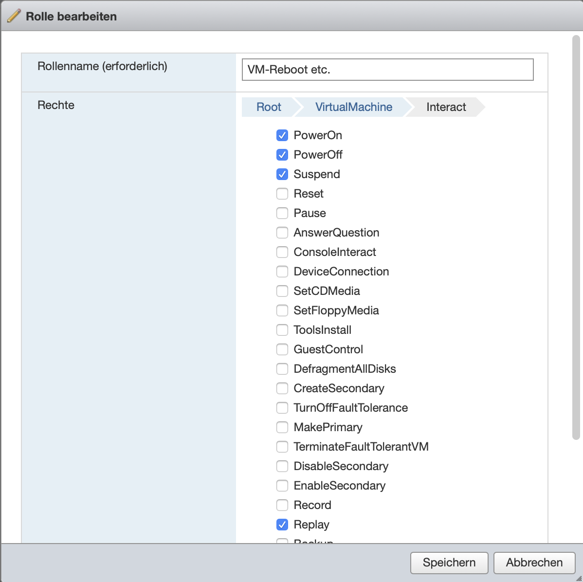 Dann muesste man mal vergleichen was die Rollen, welche es im vCenter gibt, an Einzelrechten aktiviert haben damit du es nachbauen kannst. Die Frage ob es in der Doku irgendwo mal gelistet ist. Was passiert wenn du generell ReadOnly dazu gibts und dann zusaetzlich dein Reboot?