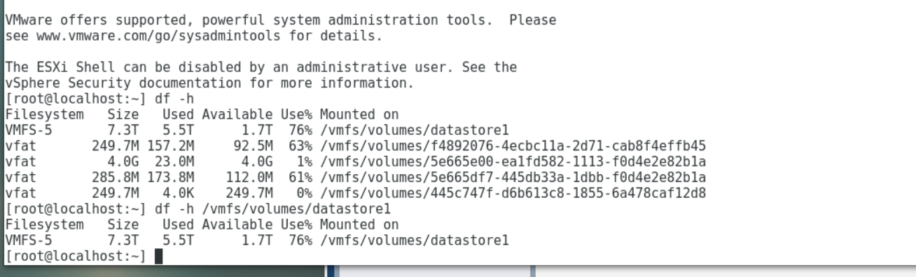 Statt des df wuerde ich eher ein "df -h *" auf dem zu betrachtenden Datastore empfehlen. Damit erhaelt man eine Uebersicht, wieviele Daten sich in den vorhandenen Ordnern des Datastores finden, und kann das dann versuchen, mit der eigenen Erwartungshaltung in Einklang zu bringen.