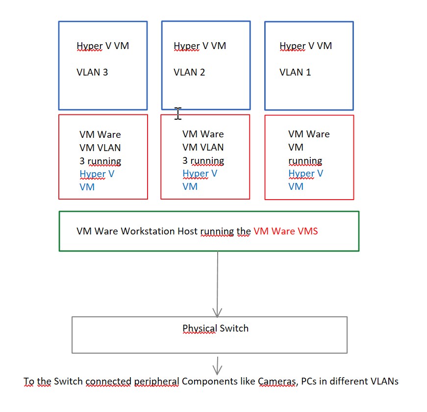 Alle 3 VMs sollen über die Hostnetzwerkkarte mit Ihren IP Adressen nach außen kommunizieren können und über einen Switch an daran angeschlossene Netzwerkkameras in dem gleichen Subnetz (10.x.x.4 /24) kommunizieren können.