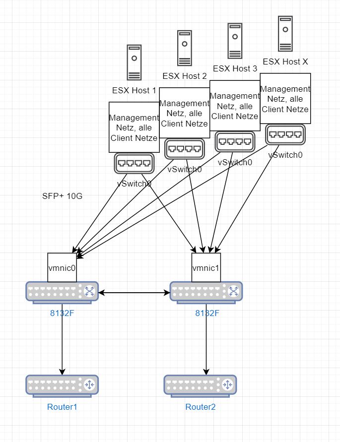 Vorhanden sind 7 ESXi Hosts mit eben dem betreffenden vSwitch0, welche jeweils einen Uplink auf beide Switches haben, wie auf dem Bild zu sehen.
